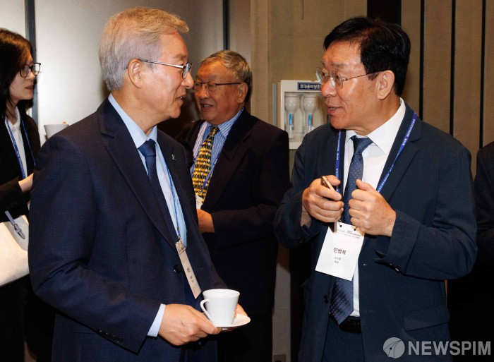 [서울=뉴스핌] 윤창빈 기자 = 민병복 뉴스핌 회장, 이병균 한국잡월드 이사장이 12일 오전 서울 여의도 페어몬트호텔 그랜드볼룸에서 종합뉴스통신사 뉴스핌 주최로 열린 제13회 2025 중국·아시아 포럼에서 대화를 나누고 있다. '이재명 정부, 아시아 실용외교의 방향과 성공의 길'을 주제로 열린 이번 포럼은 중국, 일본, 인도, 베트남 등 아시아 국가들과의 경제·문화 협력 상황을 점검하고 발전 방안을 찾기 위해 마련됐다. 2025.09.12 pangbin@newspim.com