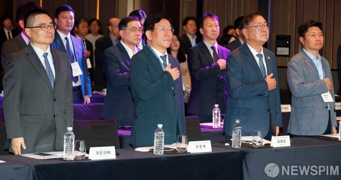 [서울=뉴스핌] 류기찬 기자 = 민병복 뉴스핌 회장(왼쪽 두 번째)과 내빈들이 12일 오전 서울 여의도 페어몬트호텔에서 열린 제13회 2025 중국-아시아 포럼에서 국민의례를 하고 있다. 이번 포럼은 '이재명 정부, 아시아 실용외교의 방향과 성공의 길'을 주제로 중국, 일본, 인도, 베트남 등 아시아 국가들과의 경제, 문화 협력 상황을 점검하고 발전 방안을 찾는다. 2025.09.12 ryuchan0925@newspim.com