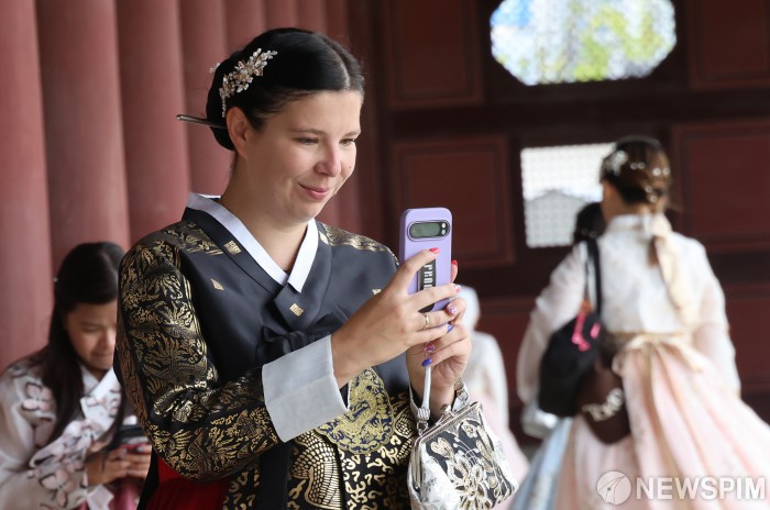 [서울=뉴스핌] 양윤모 기자 = 넷플릭스 영화 ‘케이팝 데몬 헌터스’(케데헌)의 열풍 속 13일 휴일을 맞아 서울 종로구 경복궁을 찾은 외국인 관광객들이 한복을 착용하고 한국의 문화를 체험하고 있다. 2025.09.13 yym58@newspim.com