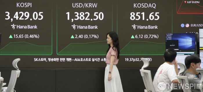 [서울=뉴스핌] 양윤모 기자 = 미국 연방준비제도(Fed)가 기준금리를 0.25%포인트 인하한 18일 오전 코스피가 전장 종가보다 15.65포인트(0.46%) 상승하며 3429.05로, 코스닥은 6.12포인트(0.72%) 상승한 851.65로 장을 시작한 가운데, 서울 중구 하나은행 딜링룸에서 직원들이 업무를 보고 있다. 서울외환시장에서 원·달러 환율은 전장 대비 2.40원 상승한 1382.50원에 거래를 시작했다. 2025.09.18 yym58@newspim.com