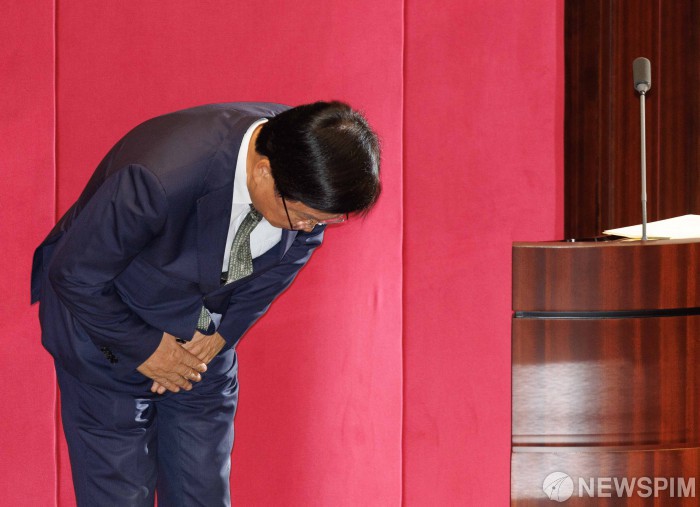 [서울=뉴스핌] 윤창빈 기자 = 최교진 부총리 겸 교육부 장관이 18일 오후 서울 여의도 국회에서 열린 본회의에서 인사를 하고 있다. 2025.09.18 pangbin@newspim.com