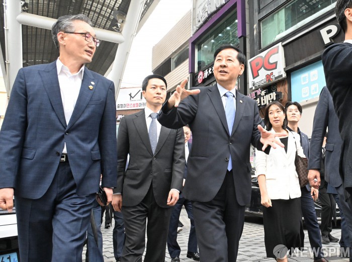 [서울=뉴스핌] 구윤철 부총리 겸 기획재정부 장관이 19일 지역관광 활성화 및 추석맞이 골목상권 현장을 점검하고자 대전시 중구 으능정리 거리를 방문하고 있다. [사진=기획재정부] 2025.09.19 photo@newspim.com