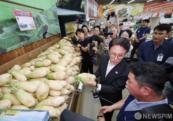 [서울=뉴스핌] 청사사진기자단 = 김민석 국무총리가 22일 오전 서울 서초구 하나로마트 양재점에서 추석 맞이 물가 현장점검을 하고 있다. 2025.09.22 photo@newspim.com