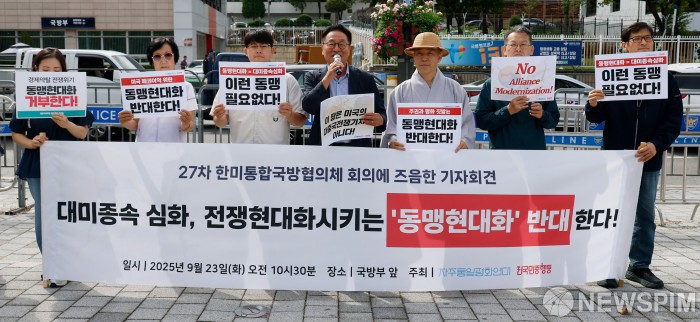[서울=뉴스핌] 류기찬 기자 = 자주통일평화연대가 23일 오전 서울 용산구 대통령실 앞에서 '27차 한미통합국방협의체 회의에 즈음한 기자회견'을 하고 있다. 2025.09.23 ryuchan0925@newspim.com