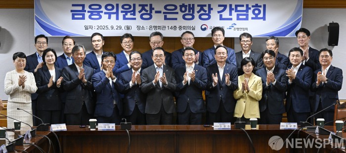 [서울=뉴스핌] 양윤모 기자 = 이억원 신임 금융위원장이 29일 오후 서울 중구 은행회관에서 열린 '금융위원장-은행장 간담회'에 참석해 박수를 치며 기념촬영을 하고 있다. 이날 간담회에는 조용병 은행연합회장, 박상진 산업은행 회장,이호성 하나은행장, 이환주 국민은행장, 정상혁 신한은행장, 정진완 우리은행장,김성태 기업은행장,강태영 농협은행장 등 20개 은행장들이 참석했다. 2025.09.29 yym58@newspim.com