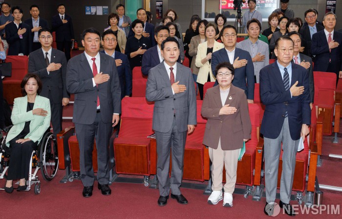 이서울=뉴스핌] 윤창빈 기자 = 장동혁 국민의힘 대표, 권영세 의원 등 참석자들이 30일 오전 서울 여의도 국회 의원회관에서 권영세 국민의힘 의원 주최로 열린 디지털 금융 혁신의 도전 : 원화 스테이블코인 도입 쟁점과 바람직한 제도적 체계 토론회에서 국민의레를 하고 있다. 2025.09.30 pangbin@newspim.com