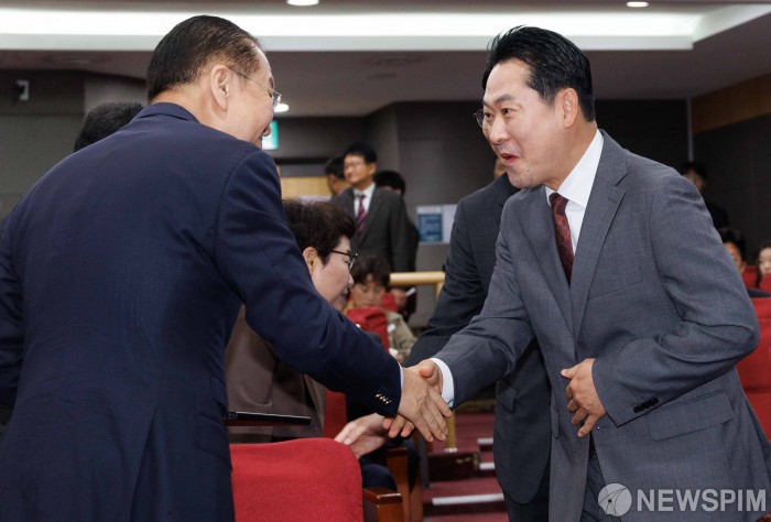 [서울=뉴스핌] 윤창빈 기자 = 장동혁 국민의힘 대표, 권영세 의원이 30일 오전 서울 여의도 국회 의원회관에서 권 의원 주최로 열린 디지털 금융 혁신의 도전 : 원화 스테이블코인 도입 쟁점과 바람직한 제도적 체계 토론회에서 인사를 나누고 있다. 2025.09.30 pangbin@newspim.com