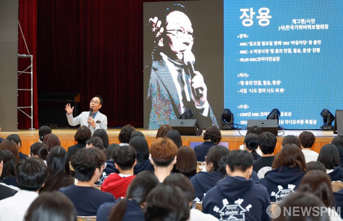 [수원=뉴스핌] 류기찬 기자 = 장용 개그맨이 30일 오후 경기 수원시 영통구 수원외국어고등학교에서 열린 '2025 경기도교육청 찾아가는 생명존중 캠페인'에서 토크 강연을 하고 있다. 2025.09.30 ryuchan0925@newspim.com