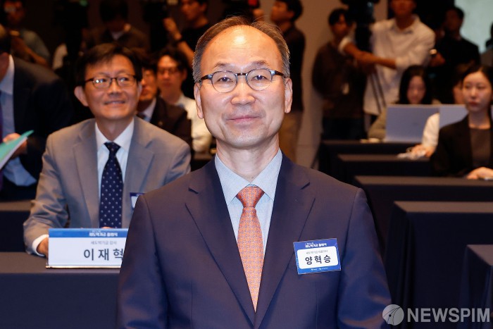 [서울=뉴스핌] 류기찬 기자 = 양혁승 새도약기금 대표이사가 1일 오전 서울 중구 한국프레스센터에서 열린 ‘새도약기금 출범식’에 참석하고 있다. 2025.10.01 ryuchan0925@newspim.com