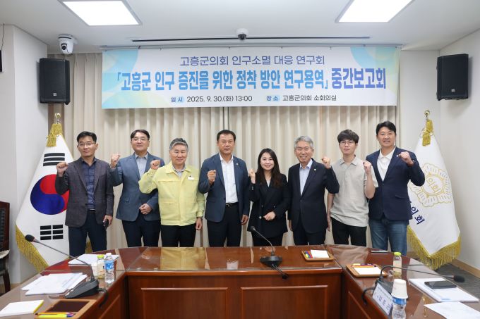 [고흥=뉴스핌] 권차열 기자 = 전남 고흥군의회 의원연구단체인 '고흥군의회 인구소멸 대응 연구회'가 군의회 소회의실에서 '고흥군 인구 증진을 위한 정착 방안 연구용역' 중간보고회를 열고 연구 진행 현황을 점검했다고 1일 밝혔다.