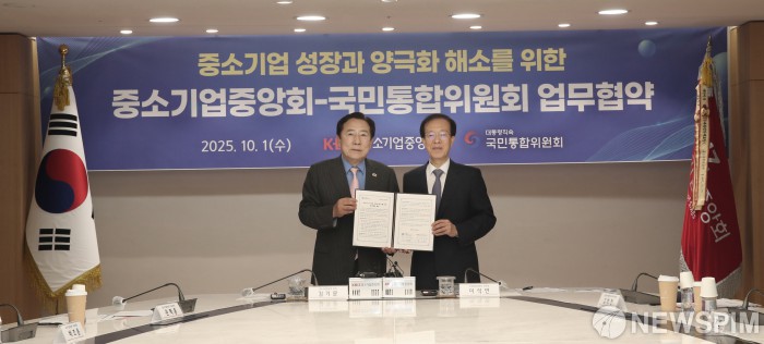 [서울=뉴스핌] 이석연 국민통합위원회 위원장이 1일 오전 서울 여의도 중기중앙회에서 중소기업 성장과 양극화 해소를 위한 중소기업중앙회- 국민통합위원회 업무협약을 체결하고 김기문 중소기업중앙회장과 기념촬영을 하고 있다.[사진=국민통합위원회] 2025.10.01 photo@newspim.com