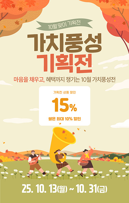 '노인기업 특가전'은 노인일자리전담기관에서 생산된 들기름, 쌀과자등 총 102여개의 제품을 최대 25% 할인(최대 5만원)하는 것이 골자다. '가치풍성 특가전'은 신선·건강식품으로 구성된 1,200여개 기획전 상품을 최대 15% 할인 판매한다. 역시 1인 2매까지 할인 쿠폰을 제공하며 최대 5만 원까지 할인 가능하다.