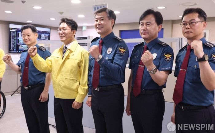 [서울=뉴스핌] 청사사진기자단= 김민석 국무총리가 2일 오전 추석연휴 비상근무기관인 서울 종로구 서울경찰청 112 종합상황실을 방문해 박정보 서울경찰청장 및 근무자들과 기념촬영을 하고 있다. 22025.10.03 photo@newspim.com