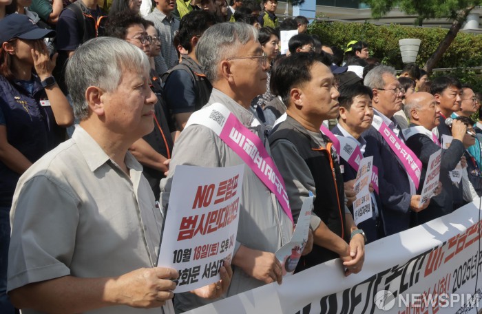 [서울=뉴스핌] 양윤모 기자 =전국민주노동조합총연맹과 전국민중행동이 추석 연휴를 앞둔 2일 서울역 광장에서 양경수 민노총 위원장이 참석하 가운데, '2025 추석맞이 귀향 선전전 및 기자회견'을 개최했다. 이날 행사에서 참석자들은 미국 트럼프 행정부의 관세·방위비 압박 규탄 및 정부의 대응과 민생 회복 대책 마련, 노동자 권리 보장 등을 촉구했다. 2025.10.02 yym58@newspim.com
