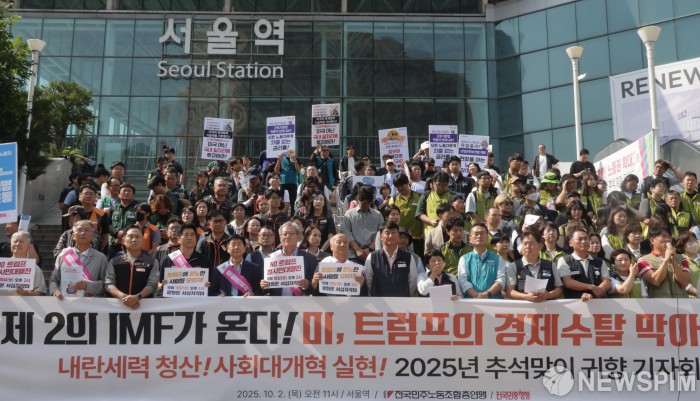 [서울=뉴스핌] 양윤모 기자 =전국민주노동조합총연맹과 전국민중행동이 추석 연휴를 앞둔 2일 서울역 광장에서 양경수 민노총 위원장이 참석하 가운데, '2025 추석맞이 귀향 선전전 및 기자회견'을 개최했다. 이날 행사에서 참석자들은 미국 트럼프 행정부의 관세·방위비 압박 규탄 및 정부의 대응과 민생 회복 대책 마련, 노동자 권리 보장 등을 촉구했다. 2025.10.02 yym58@newspim.com
