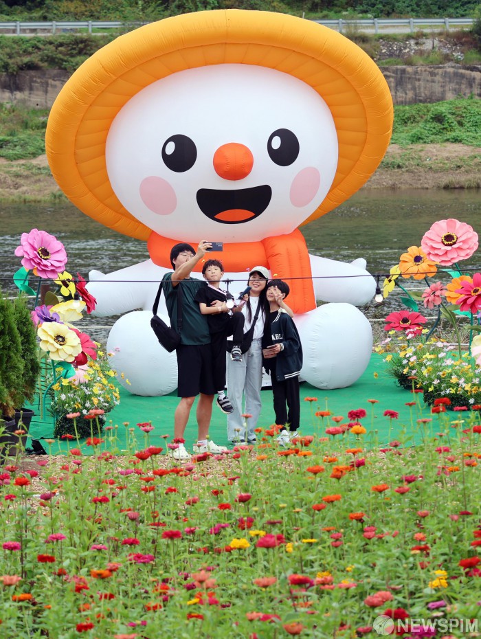 [서울=뉴스핌] 양윤모 기자 = 3일 오후 추석연휴를 맞아 평창읍 평창강 일원에서 열린 '2025 평창 백일홍축제'를 찾은 방문객들이 눈동이 조형물을 배경으로 기념사진을 촬영하고 있다. '가을향기, 백일홍으로 물들다'를 주제로 열리는 올 해 축제는 백일홍, 코스모스 등 다양한 볼거리 및 체험 프로그램으로 12일까지 펼쳐진다. 이와 함께 축제 기간 평창읍 기관과 주민이 참여하는 야시장과 먹거리 존이 운영되며, 연계 행사로 평창읍 전통시장에서는 달빛장터, 노람들에서는 한가위 평창 에코라이트쇼가 개최된다. [사진= 평창군청] 2025.10.03 yym58@newspim.com