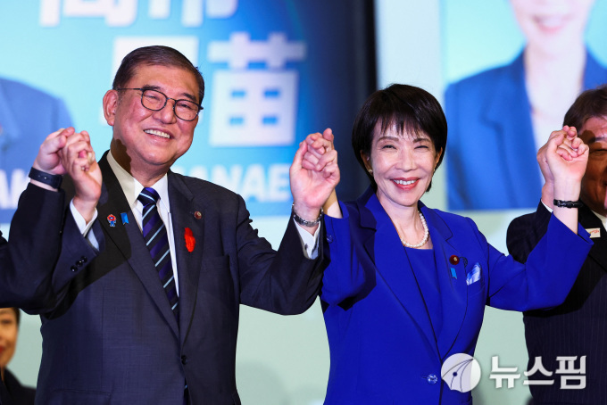 [사진] 이시바와 손잡고 선거 승리 축하하는 다카이치