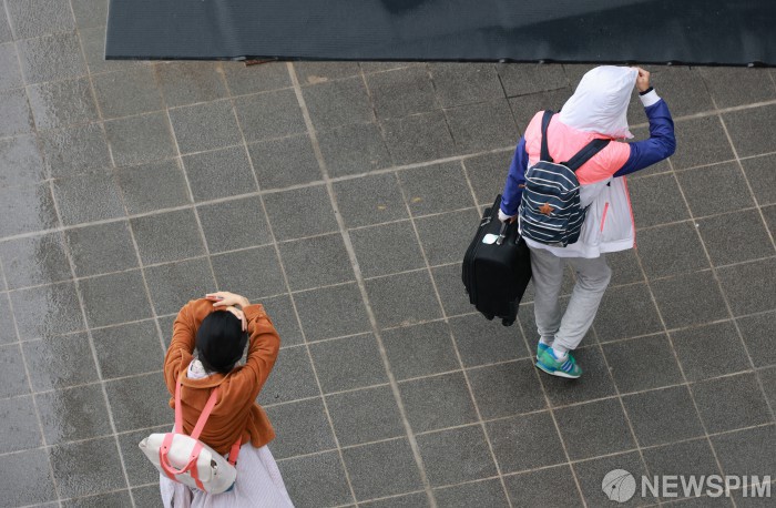 [서울=뉴스핌] 김학선 기자 = 추석 전날인 5일 전국적으로 비가 내리는 가운데 서울역에서 시민들이 비를 피해 걷고 있다. 2025.10.05 yooksa@newspim.com
