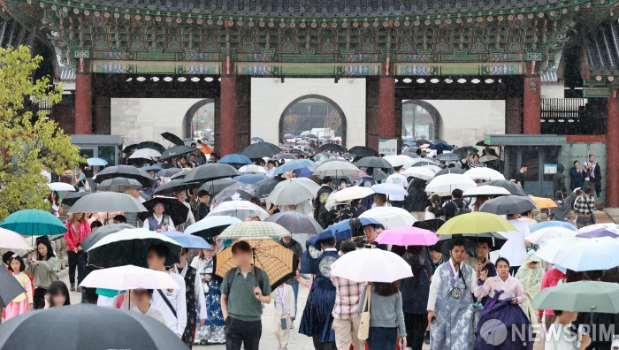 [서울=뉴스핌] 김학선 기자 = 추석 황금연휴를 맞아 서울의 주요 궁궐과 종묘, 조선왕릉 등이 무료 개방한 가운데 5일 서울 경복궁이 우산을 쓴 관람객들로 붐비고 있다. 2025.10.05 yooksa@newspim.com