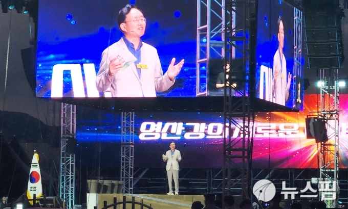 [나주=뉴스핌] 조은정 기자 = 윤병태 전남 나주시장이 8일 영산강정원 일원에서 개최된 '2025 나주영산강축제'의 주무대에 올라 인사말을 하고 있다. 2025.10.08 ej7648@newspim.com