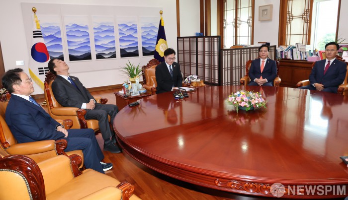 [서울=뉴스핌] 정일구 기자 = 허영 더불어민주당 정책수석부대표(왼쪽부터), 김병기 원내대표, 우원식 국회의장, 송언석 국민이힘 원내대표, 유상범 원내수석부대표가 25일 오후 서울 여의도 국회에서 열린 국회의장 주재 여야 원내대표 회동에서 무거운 표정으로 앉아 있다. 2025.09.25 mironj19@newspim.com |