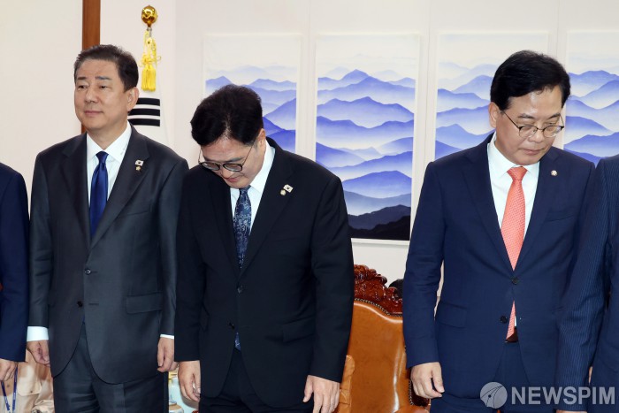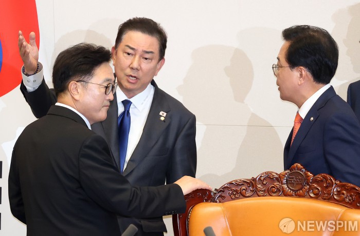 [서울=뉴스핌] 정일구 기자 = 우원식 국회의장이 25일 오후 서울 여의도 국회에서 여야 원내대표들과 회동을 하고 있다. 왼쪽부터 김병기 더불어민주당 원내대표, 우 의장, 송언석 국민의힘 원내대표. 2025.09.25 mironj19@newspim.com |