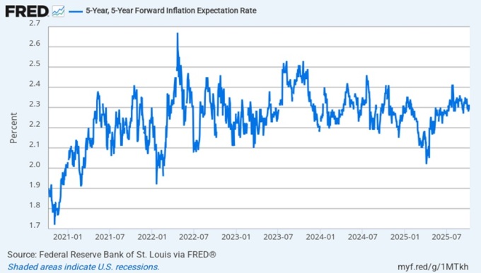 미국 국채시장이 반영하고 있는 5년 후 5년 동안의 기대 인플레이션 추이 [출처=연방준비제도] |