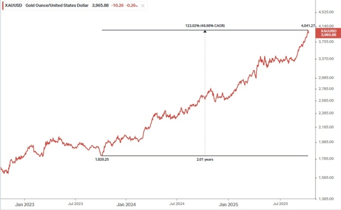최근 2년 동안 금값은 120% 넘게 상승했다 [사진=koyfin] |