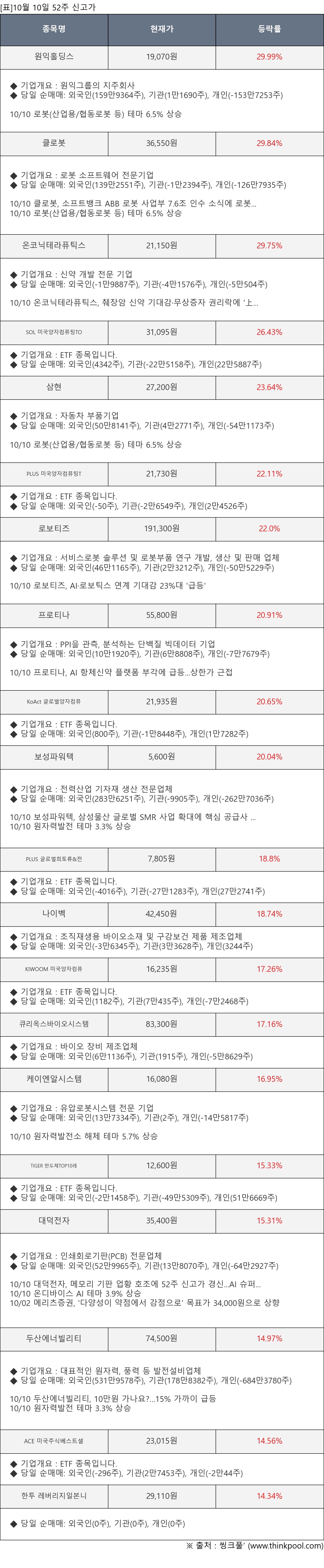 [서울=뉴스핌] 로보뉴스 = 10월 10일, 인공지능 투자비서 ‘AI라씨로’가 원익홀딩스(030530), 클로봇(466100) 등 52주 신고가가 발생한 종목들에 대한 최근 동향을 분석했다.