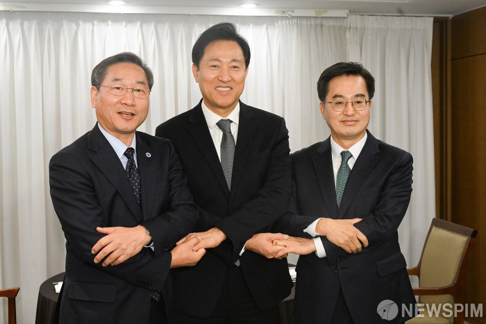 수도권 대체매립지 4차 공모 결과, 민간 2곳이 응모했다. 사진은 지난 2023년 11월16일 오세훈 서울시장·김동연 경기도지사·유정복 인천시장이 비공개 회동을 가진 모습. 이날 회동한 단체장들은 수도권매립지 등 여러 현안을 논의했다. [뉴스핌DB]