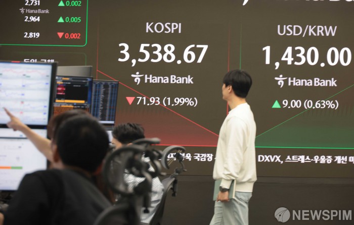 [서울=뉴스핌] 이길동 기자 = 13일 오전 서울 중구 하나은행 딜링룸에 코스피-코스닥 지수 및 달러/원 환율이 표시되어 있다. 이날 코스피는 전 거래일보다 60.52p(1.68%) 내린 3550.08에 코스닥 지수는 전 거래일보다 13.73p(1.60%) 내린 845.76에 거래를 시작했다. 서울 외환시장에서 달러/원 환율은 전장보다 9.0원 오른 1430.0원에 개장했다.2025.10.13 gdlee@newspim.com