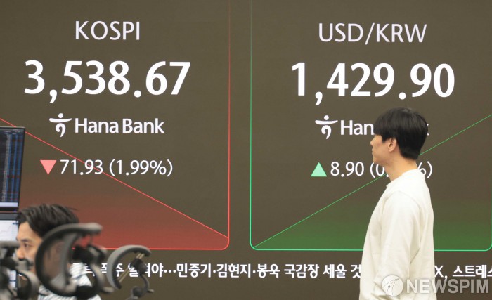 [서울=뉴스핌] 이길동 기자 = 13일 오전 서울 중구 하나은행 딜링룸에 코스피-코스닥 지수 및 달러/원 환율이 표시되어 있다. 이날 코스피는 전 거래일보다 60.52p(1.68%) 내린 3550.08에 코스닥 지수는 전 거래일보다 13.73p(1.60%) 내린 845.76에 거래를 시작했다. 서울 외환시장에서 달러/원 환율은 전장보다 9.0원 오른 1430.0원에 개장했다.2025.10.13 gdlee@newspim.com