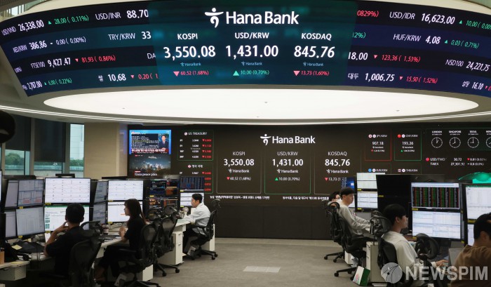 [서울=뉴스핌] 이길동 기자 = 13일 오전 서울 중구 하나은행 딜링룸에 코스피-코스닥 지수 및 달러/원 환율이 표시되어 있다. 이날 코스피는 전 거래일보다 60.52p(1.68%) 내린 3550.08에 코스닥 지수는 전 거래일보다 13.73p(1.60%) 내린 845.76에 거래를 시작했다. 서울 외환시장에서 달러/원 환율은 전장보다 9.0원 오른 1430.0원에 개장했다.2025.10.13 gdlee@newspim.com
