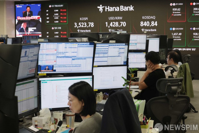 [서울=뉴스핌] 이길동 기자 = 13일 오전 서울 중구 하나은행 딜링룸에 코스피-코스닥 지수 및 달러/원 환율이 표시되어 있다. 이날 코스피는 전 거래일보다 60.52p(1.68%) 내린 3550.08에 코스닥 지수는 전 거래일보다 13.73p(1.60%) 내린 845.76에 거래를 시작했다. 서울 외환시장에서 달러/원 환율은 전장보다 9.0원 오른 1430.0원에 개장했다.2025.10.13 gdlee@newspim.com