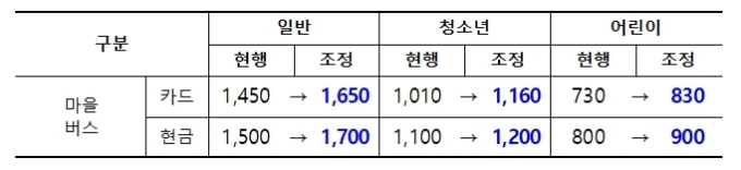 인상된 요금은 경기도 시내버스 요금과 같은 기준으로 책정됐으며 오는 25일 첫차에 함께 인상되는데 교통카드 기준으로 일반인은 1450원에서 1650원, 청소년은 1010원에서 1160원, 어린이는 730원에서 830원으로 조정된다.