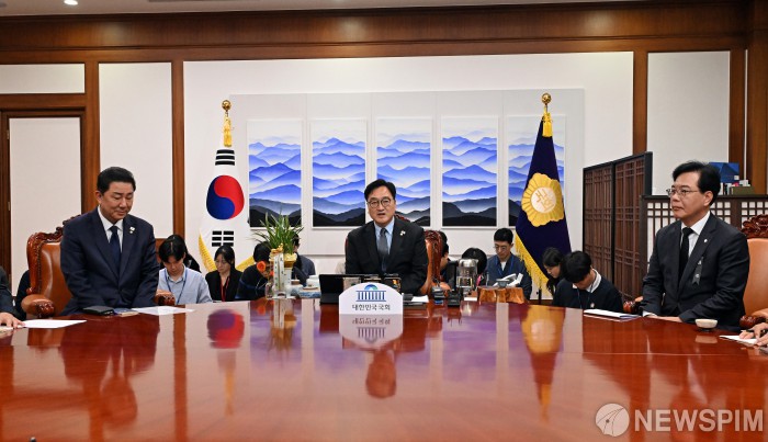 [서울=뉴스핌] 류기찬 기자 = 우원식 국회의장(가운데)이 13일 오후 서울 여의도 국회에서 열린 국회의장 주재 여야 원내대표 회동에서 발언을 하고 있다. 2025.10.13 ryuchan0925@newspim.com