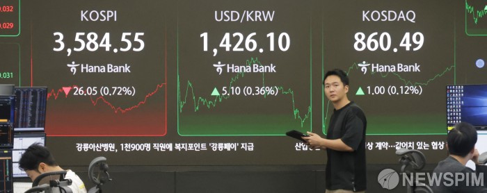 [서울=뉴스핌] 양윤모 기자 = 미·중 간 무역 갈등이 재점화된 가운데 13일 오후 코스피가 전장 종가보다 26.05 포인트(0.72%) 하락하며 3584.55로, 코스닥은 1.00 포인트(0.12%) 상승한 860.49로 장을 마감한 가운데, 서울 중구 하나은행 딜링룸에서 직원들이 업무를 보고 있다. 서울외환시장에서 달러/원 환율은 전장 대비 5.10원 상승한 1426.10원에 거래를 마감했다. 2025.10.13 yym58@newspim.com