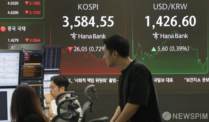 [서울=뉴스핌] 양윤모 기자 = 미·중 무역 갈등이 재점화된 가운데 13일 오후 코스피가 전장 종가보다 26.05 포인트(0.72%) 하락하며 3584.55로, 코스닥은 1.00 포인트(0.12%) 상승한 860.49로 장을 마감한 가운데, 서울 중구 하나은행 딜링룸에서 직원들이 업무를 보고 있다. 서울외환시장에서 달러/원 환율은 전장 대비 5.60원 상승한 1426.60원에 거래를 마감했다. 2025.10.13 yym58@newspim.com