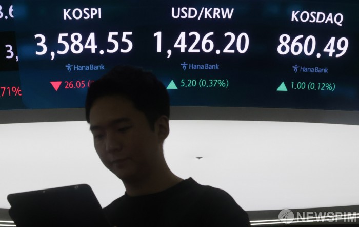 [서울=뉴스핌] 양윤모 기자 = 미·중 무역 갈등이 재점화된 가운데 13일 오후 코스피가 전장 종가보다 26.05 포인트(0.72%) 하락하며 3584.55로, 코스닥은 1.00 포인트(0.12%) 상승한 860.49로 장을 마감한 가운데, 서울 중구 하나은행 딜링룸에서 직원들이 업무를 보고 있다. 서울외환시장에서 달러/원 환율은 전장 대비 5.20원 상승한 1426.20원에 거래를 마감했다. 2025.10.13 yym58@newspim.com