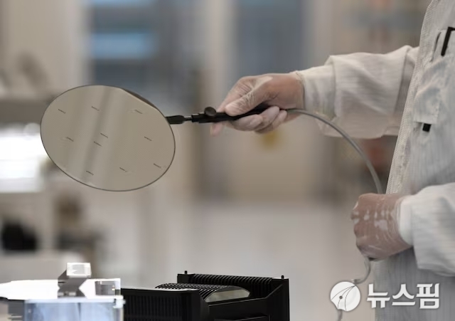 지난해 6월 27일(현지 시간) 독일 함부르크에 있는 네덜란드 반도체 회사 넥스페리아의 생산라인에서 한 직원이 웨이퍼를 다루고 있다. [사진=로이터 뉴스핌] |