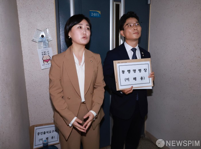 [서울=뉴스핌] 류기찬 기자 = 국회 교육위원회 더불어민주당 백승아(왼쪽)·정을호 의원이 14일 오후 서울 마포구에 위치한 이배용 전 국가교육위원장의 자택 앞에서 동행명령장 집행에 실패 한 뒤 발언을 하고 있다. 2025.10.14 ryuchan0925@newspim.com
