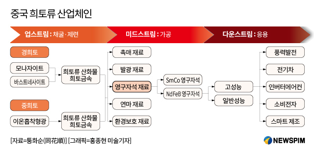 희토류 영구자석 산업 사슬은 △업스트림 : 희토류 자원의 채굴과 1차 가공 △미드스트림 : 희토류 영구자석 소재의 제조 △다운스트림 : 전기차(구동 모터), 풍력 발전 설비(발전기), 소비자 전자제품(휴대폰 진동 모터), 산업용 모터, 의료 장비, 군수 산업 등 다변화된 응용 분야로 분류된다. 특히, 고성능 희토류 영구자석 수요가 빠르게 늘어날 것으로 기대되는 3대 다운스트림 산업은 △휴머노이드 로봇 △신에너지차 △풍력발전이 꼽힌다.