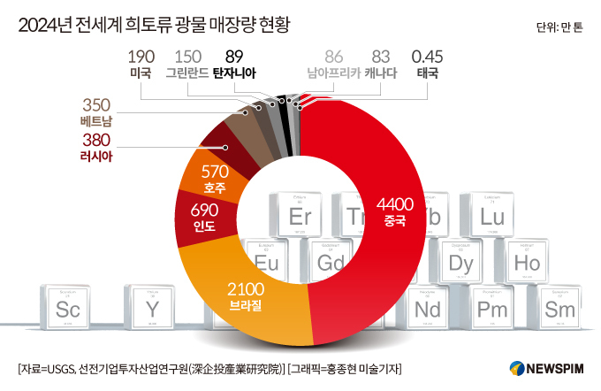 미국 지질조사국(USGS)의 통계에 따르면 2024년 말 기준 전세계 희토류 자원의 총 매장량은 9000만 톤(t) 이상으로 집계됐다. 그 중 중국의 매장량은 4400만 t으로 전세계 매장량의 약 48%를 차지해 1위를 차지하고 있다.