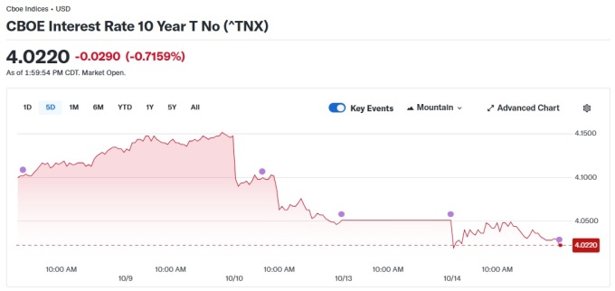 미 국채 10년물 금리 차트, 자료=야후 파이낸스, 2025.10.15 koinwon@newspim.com |