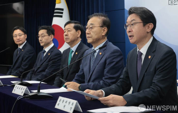 [서울=뉴스핌] 이길동 기자 = 이억원 금융위원장이 15일 오전 서울 종로구 정부서울청사에서 열린 주택시장 안정화 대책 관계부처 합동브리핑에서 발언하고 있다. 왼쪽부터 임광현 국세청장, 윤창렬 국무조정실장, 구윤철 부총리, 김윤덕 국토교통부 장관, 이억원 금융위원장. 2025.10.15 gdlee@newspim.com