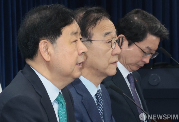 [서울=뉴스핌] 이길동 기자 = 구윤철 부총리 겸 기획재정부 장관이 15일 오전 서울 종로구 정부서울청사에서 열린 주택시장 안정화 대책 관계부처 합동브리핑에서 모두 발언을 하고 있다.왼쪽부터 임광현 국세청장,윤창렬 국무조정실장,구 부총리, 김윤덕 국토교통부 장관, 이억원 금융위원장 2025.10.15gdlee@newspim.com