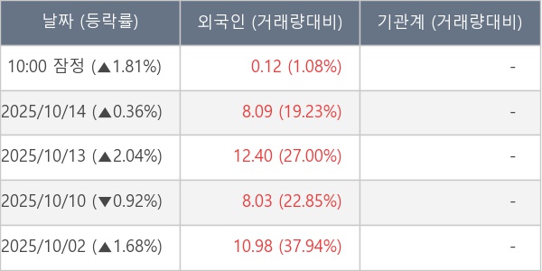 [서울=뉴스핌] 로보뉴스 = 15일 10시 15분 현재 오리엔트정공(065500)은 전일 대비 1.81% (현재가 2,810원) 상승했고, 외국인이 최근 5일 연속 순매수(누적 39.62만 주, 잠정) 행진을 하고 있다.
