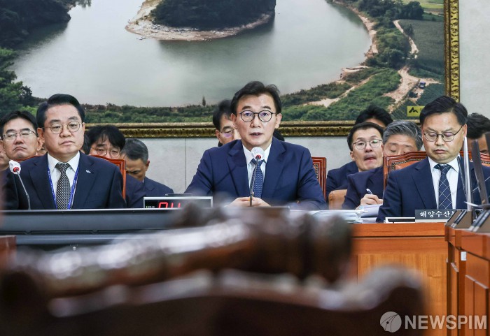 [서울=뉴스핌] 윤창빈 기자 = 전재수 해양수산부 장관이 15일 오전 서울 여의도 국회에서 열린 농림축산식품해양수산위원회의 해양수산부 등에 대한 국정감사에서 의원 질문에 답변하고 있다. 2025.10.15 pangbin@newspim.com