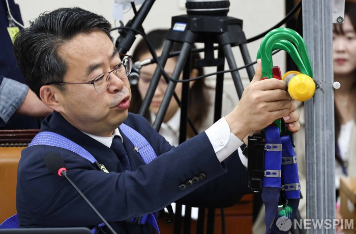 [서울=뉴스핌] 윤창빈 기자 = 박홍배 더불어민주당 의원이 15일 오전 서울 여의도 국회에서 열린 기후에너지환경노동위원회의 고용노동부 국정감사에서 스마트 안전고리 시연을 하고 있다. 2025.10.15 pangbin@newspim.com