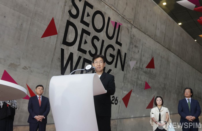 [서울=뉴스핌] 양윤모 기자 = 박준모 무신사대표가 15일 오전 서울 동대문디자인플라자(DDP) 아트홀입구에서 개최된 국내외 디자이너와 기업이 참여하는 디자인 비즈니스 페어인 '서울디자인위크 개막식'에 참석해 축사를 하고 있다. 국내외 디자이너와 브랜드가 함께하는 ‘DDP디자인페어’는 약 100여 개의 라이프스타일 브랜드가 선보인다. 2025.10.15 yym58@newspim.com